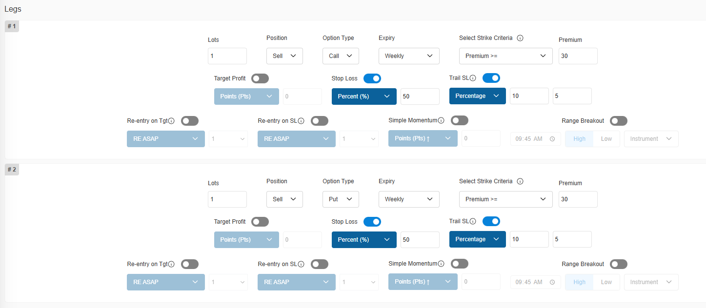 - Leg1: Sell CE with closest premium greater than 30