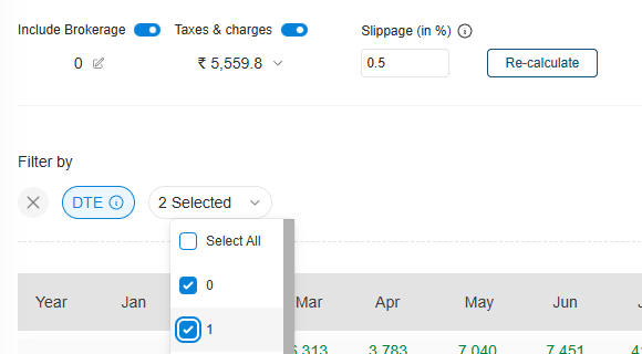 Slippage is set to 0.5 percent and all charges are included except brokerage. I use Kotak Neo, so brokerage is zero. In the DTE filter, I select 0 and 1.