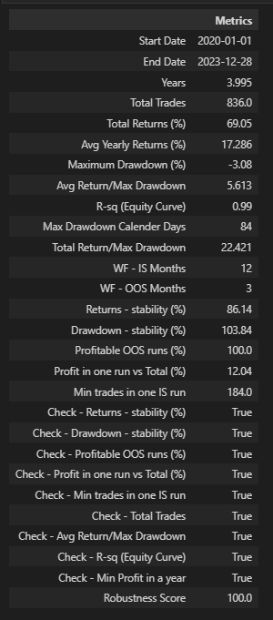- This curve shows full out-of-sample results, where all parameters were tested. From 2020 to 2023, the performance is completely out of sample, so the confidence is higher.